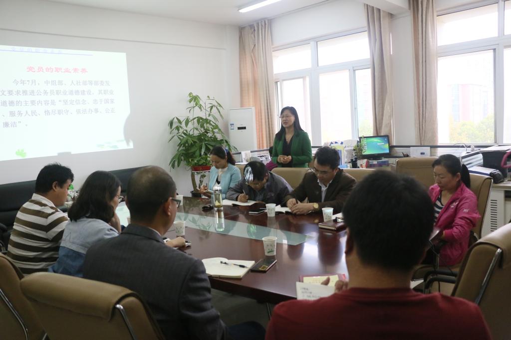 10月11日下午,学科-校地党支部和教学质量监控与评估处党支部联合举办了“党员的职业素养”培训会,两个党支部的全体党员参加了培训会,会议由校地办主任郭超峰教授主持,质评处处长张莉教授主讲。