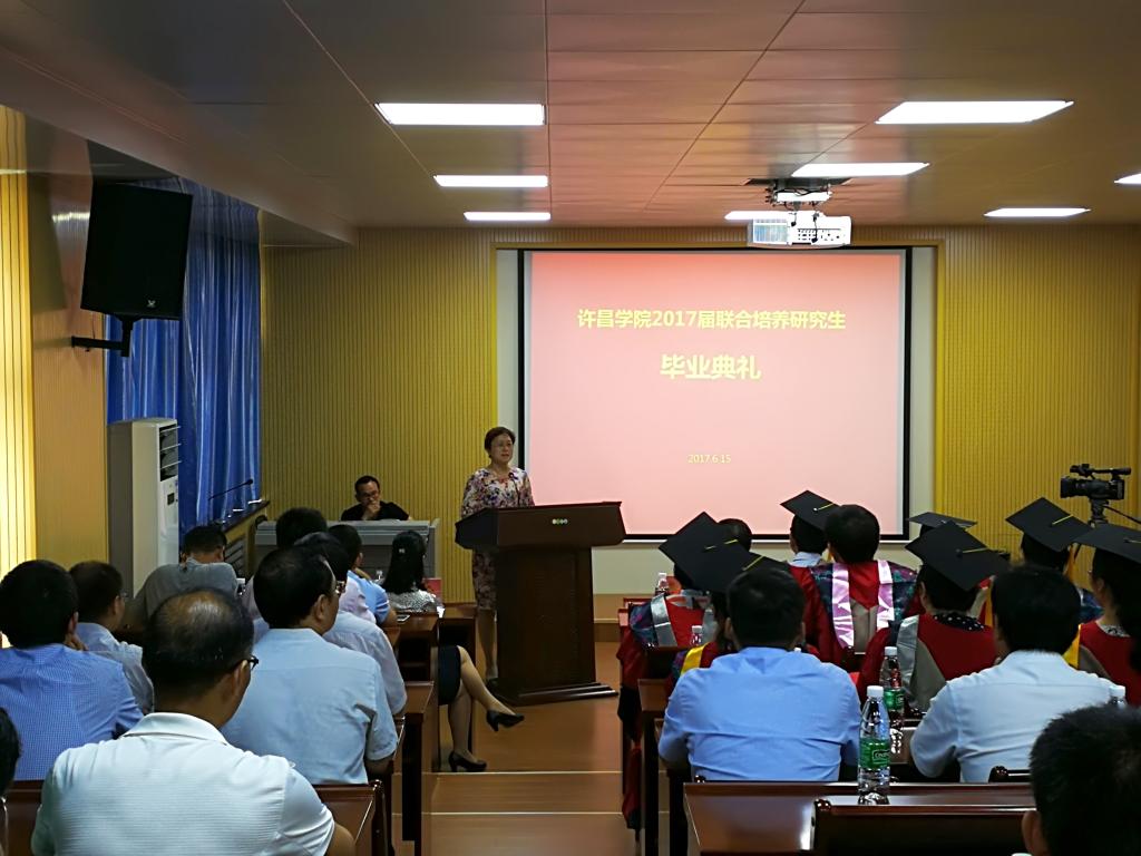 6月15日下午,2017届许昌学院与电子科技大学、南京理工大学、郑州大学、河南大学联合培养研究生毕业典礼在我校食品与生物工程学院学术报告厅隆重举行。院长、博士生导师赵继红,副院长、博士生导师郑直与我校全体研究生导师、2017届毕业研究生及部分在读的联合培养研究生共聚一堂,欢庆盛典。毕业典礼由田萍主持。
