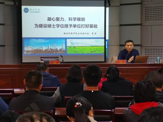 10月11日,为更好地推进我校硕士学位授予单位立项建设和硕士学位授权点建设工作,我校邀请榆林学院研究生处副处长高芸做了有关申硕经验分享的报告。郑直副院长出席了报告会,各职能部门的主要领导、各申硕培育点负责人、申硕培育点的全体成员及学科方向带头人参加了报告会,会议由学科办副主任郭卫芸主持。