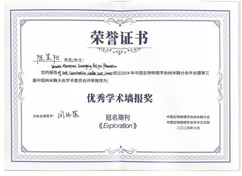 在大会闭幕式上,团队研究生陈昱阳同学所作墙报《Versatile MXenzymes scavenging ROS for promotion of seed germination under salt stress》从百余份作品中脱颖而出,荣获大会优秀墙报奖。